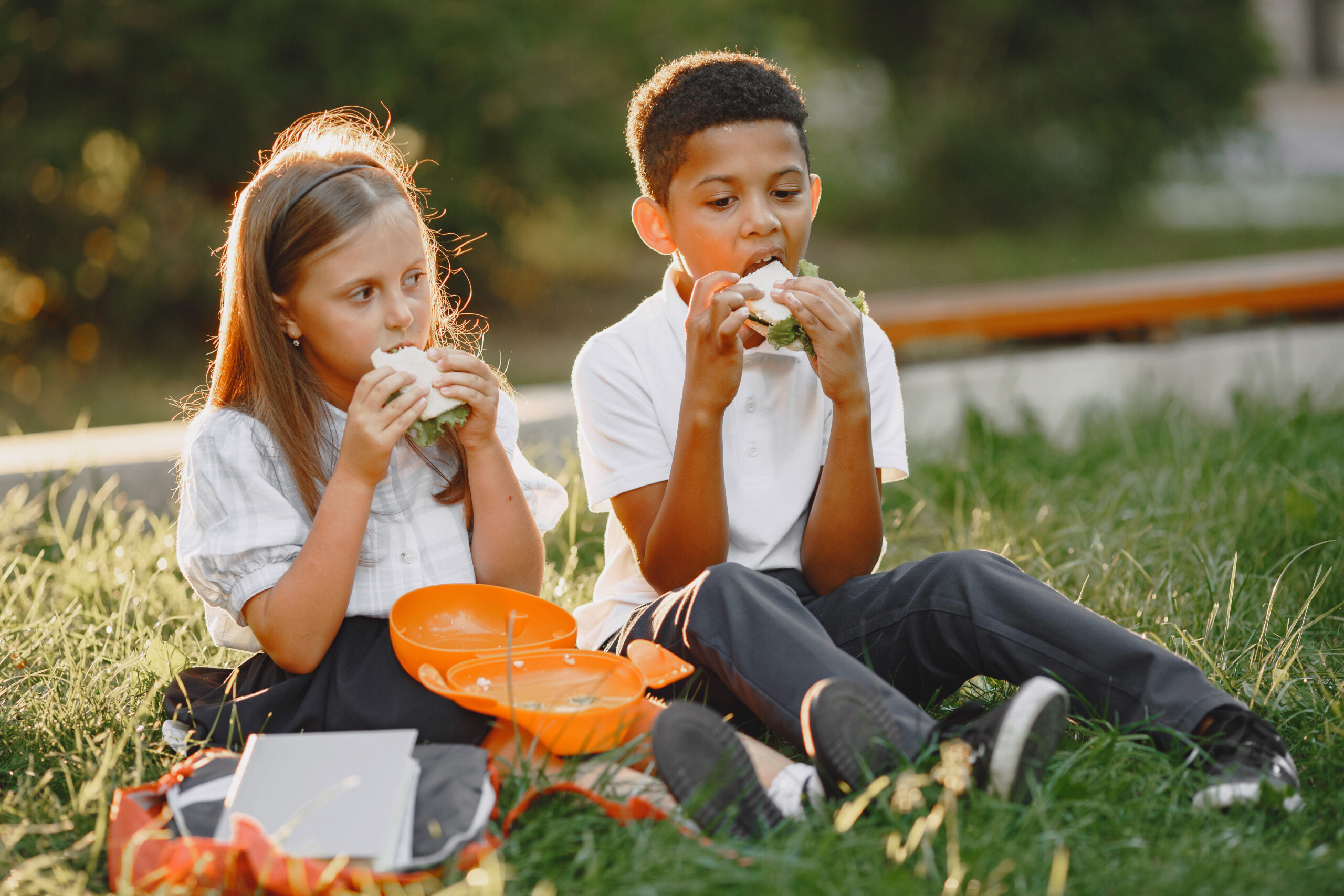 Original size is 2560 × 1707 pixelsMixed-races boy and little girl. Junior students in a schoolyard. Pretty Caucasian girl. African American cute boy in white t-shirt. Pupils concept